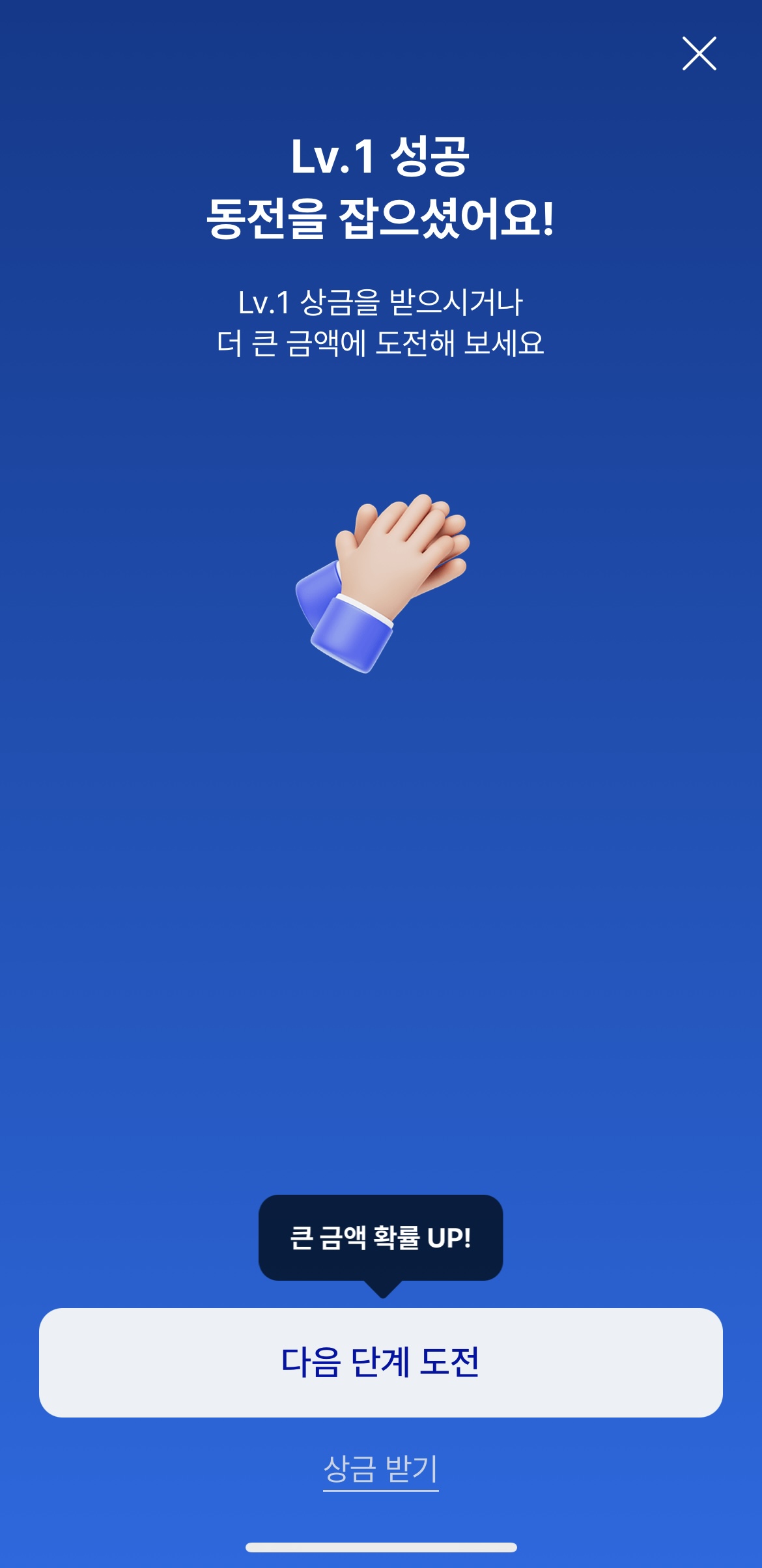 단계가 올라갈수록 상금은 커지지만 실패하면 그동안 쌓인 상금은 사라집니다. 그래서 본인이 만족하는 구간에서 멈추고 상금을 수령하는 것이 현명한 방법입니다.