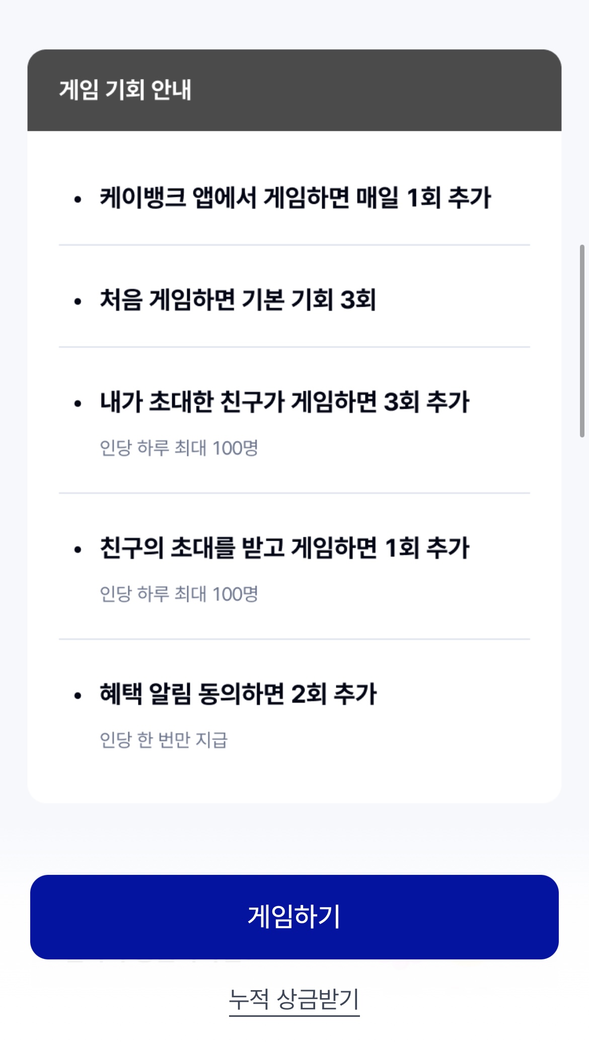 실패했을 때 기회가 사라지는 것이 아쉬울 수 있습니다. 하지만 케이뱅크에서는 친구에게 링크를 공유하면 기회를 3번씩 추가로 얻을 수 있습니다. 어려운 과정은 전혀 없고, 단순히 링크를 공유하고 친구가 접속만 해주면 됩니다. 이 방식으로 기회를 확보하면 실패에 대한 부담을 줄이고 더 많은 도전을 할 수 있습니다.