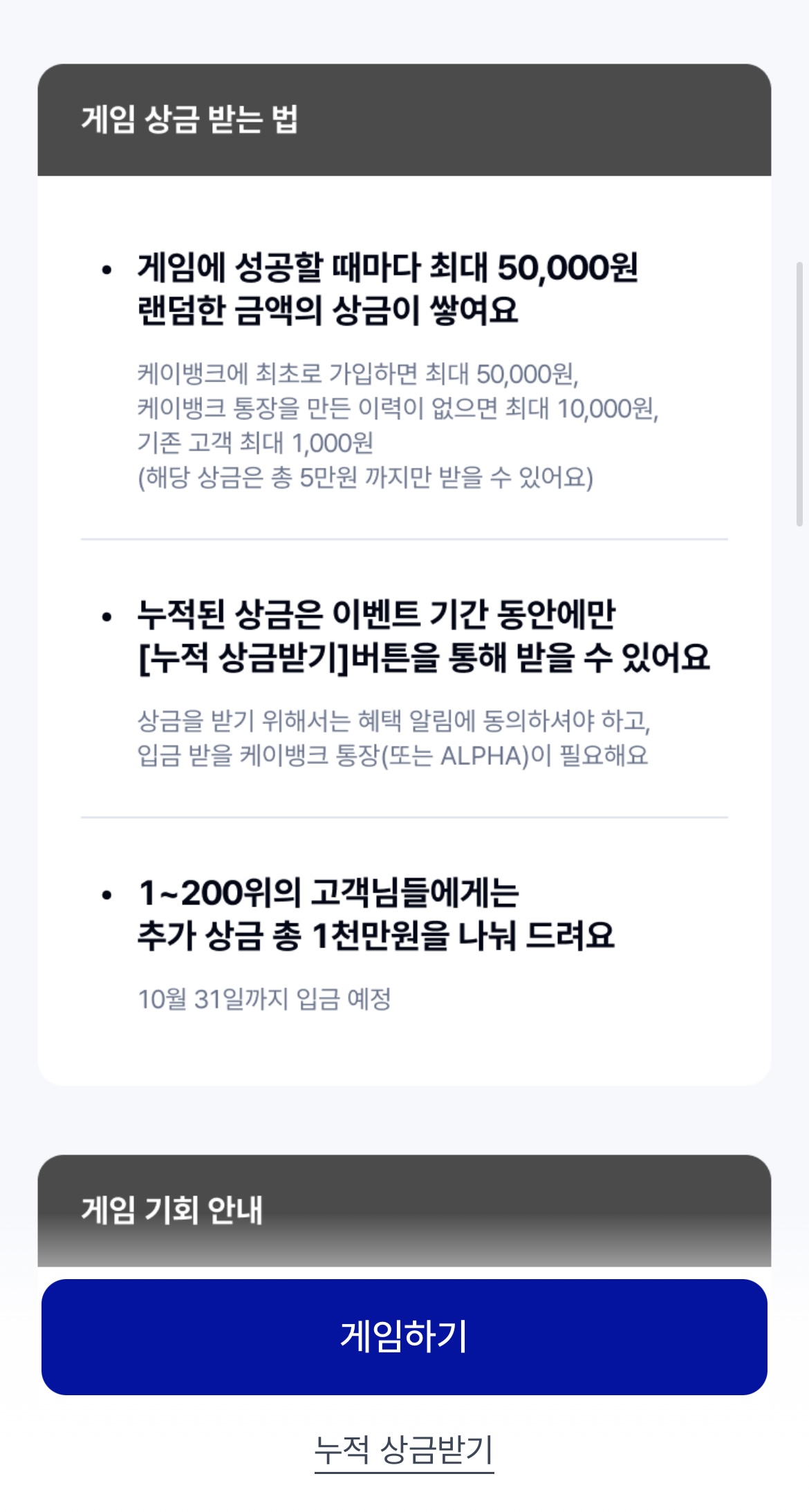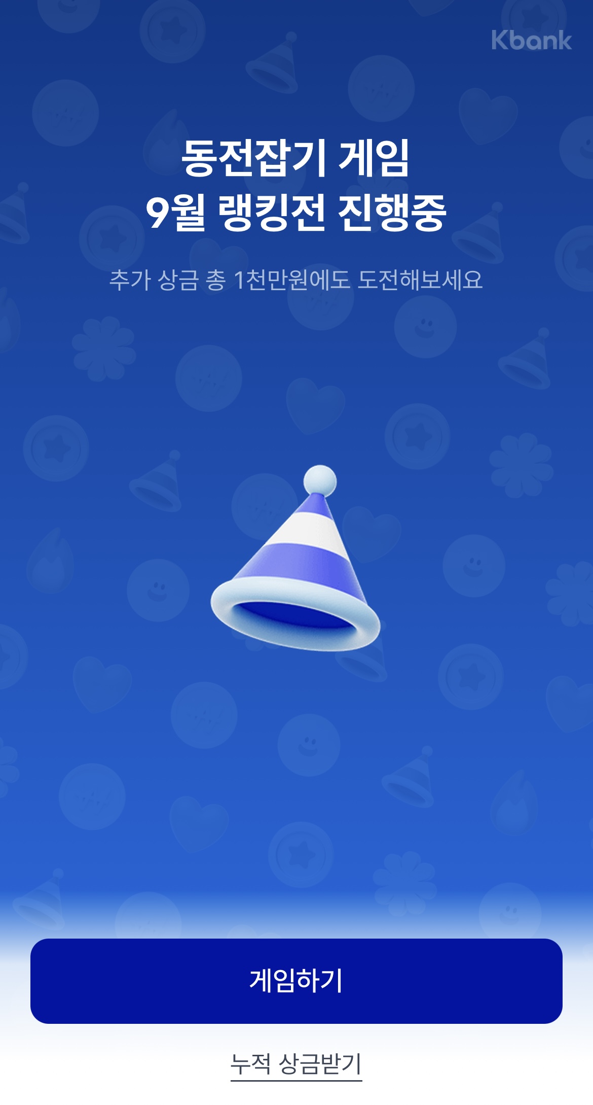 케이뱅크 동전잡기는 사용자가 직접 참여 버튼을 누르고 동전이 나오는 순간을 클릭하면 성공 여부가 결정됩니다. 단계별 성공 시에는 상금을 받을 수 있고, 받은 상금은 바로 케이뱅크 계좌로 입금됩니다.